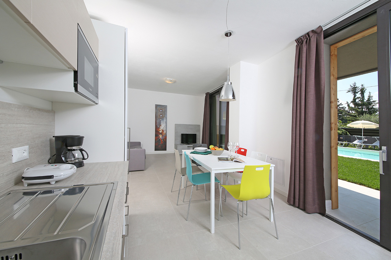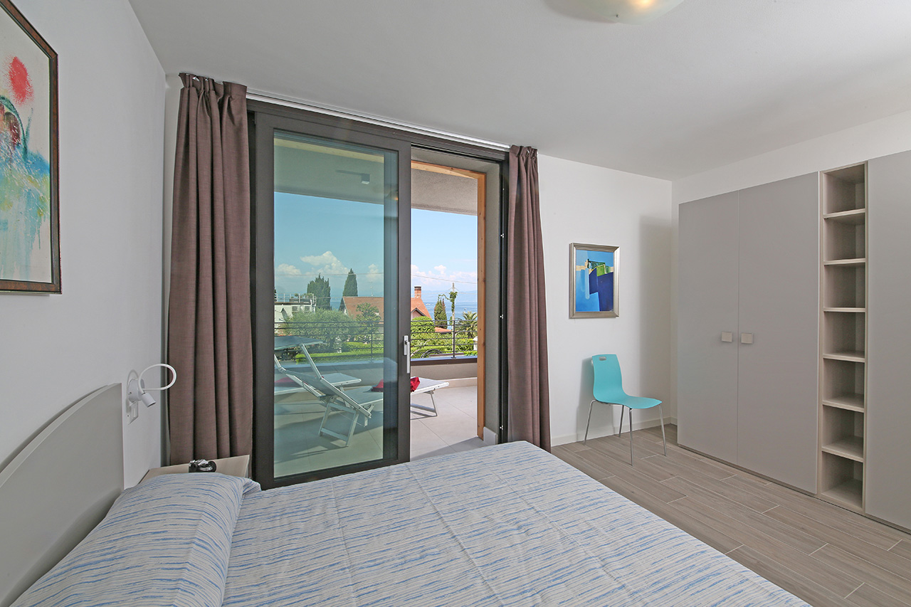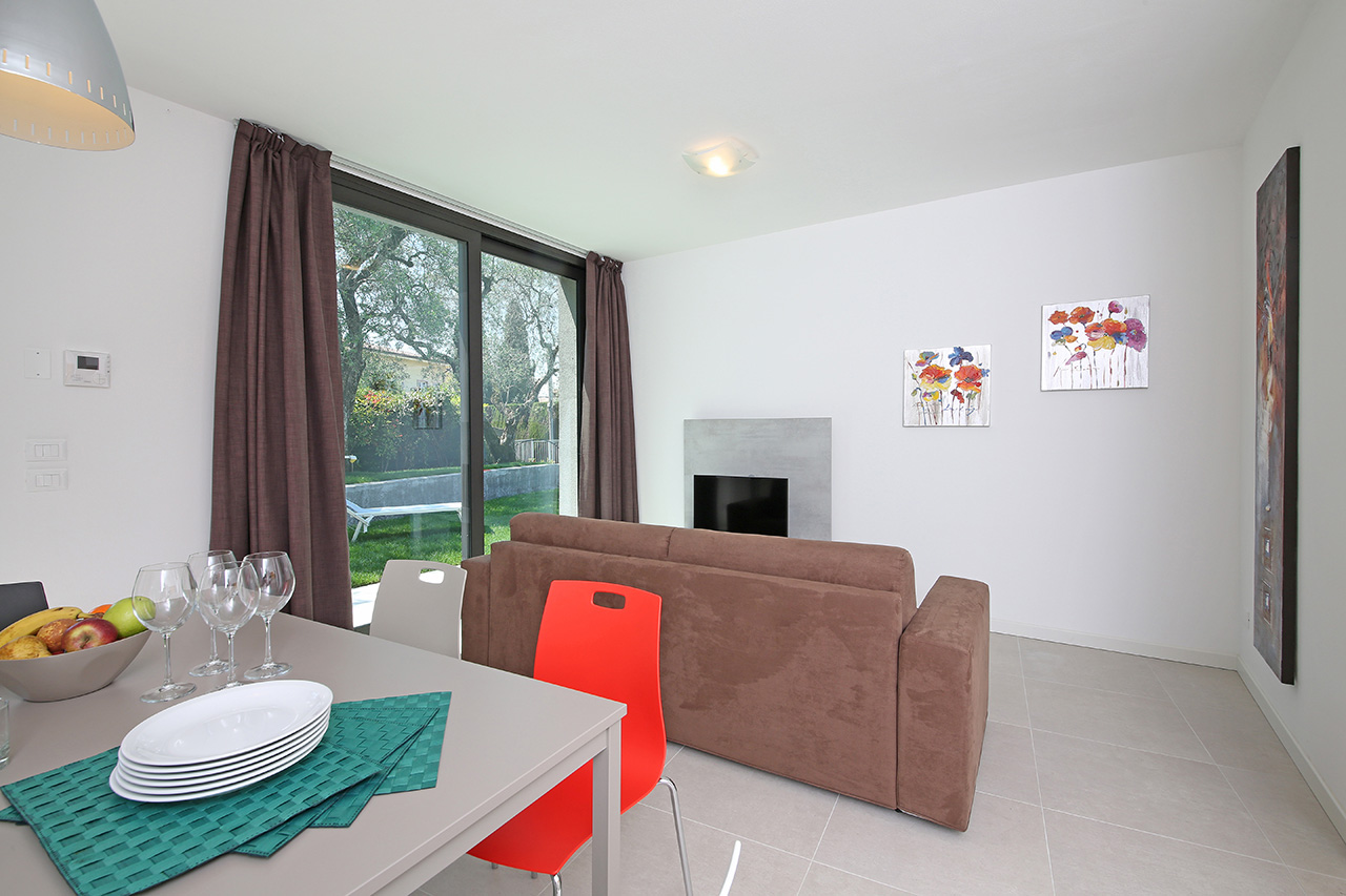 Appartamento con soggiorno, divano letto doppio, angolo cottura, una camera doppia, una camera a 2 letti, bagno con doccia. Solarium con vista lago.