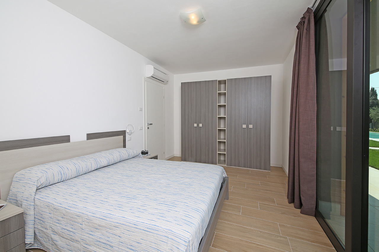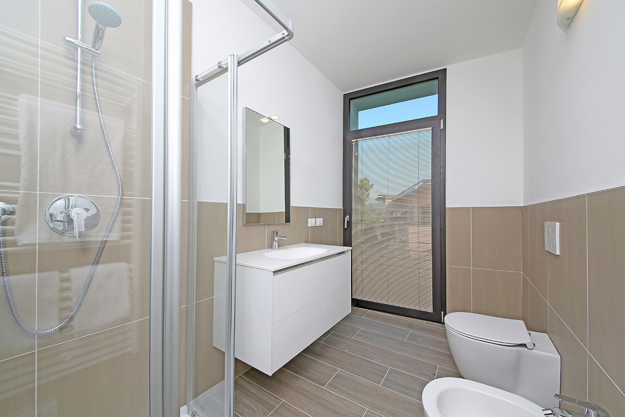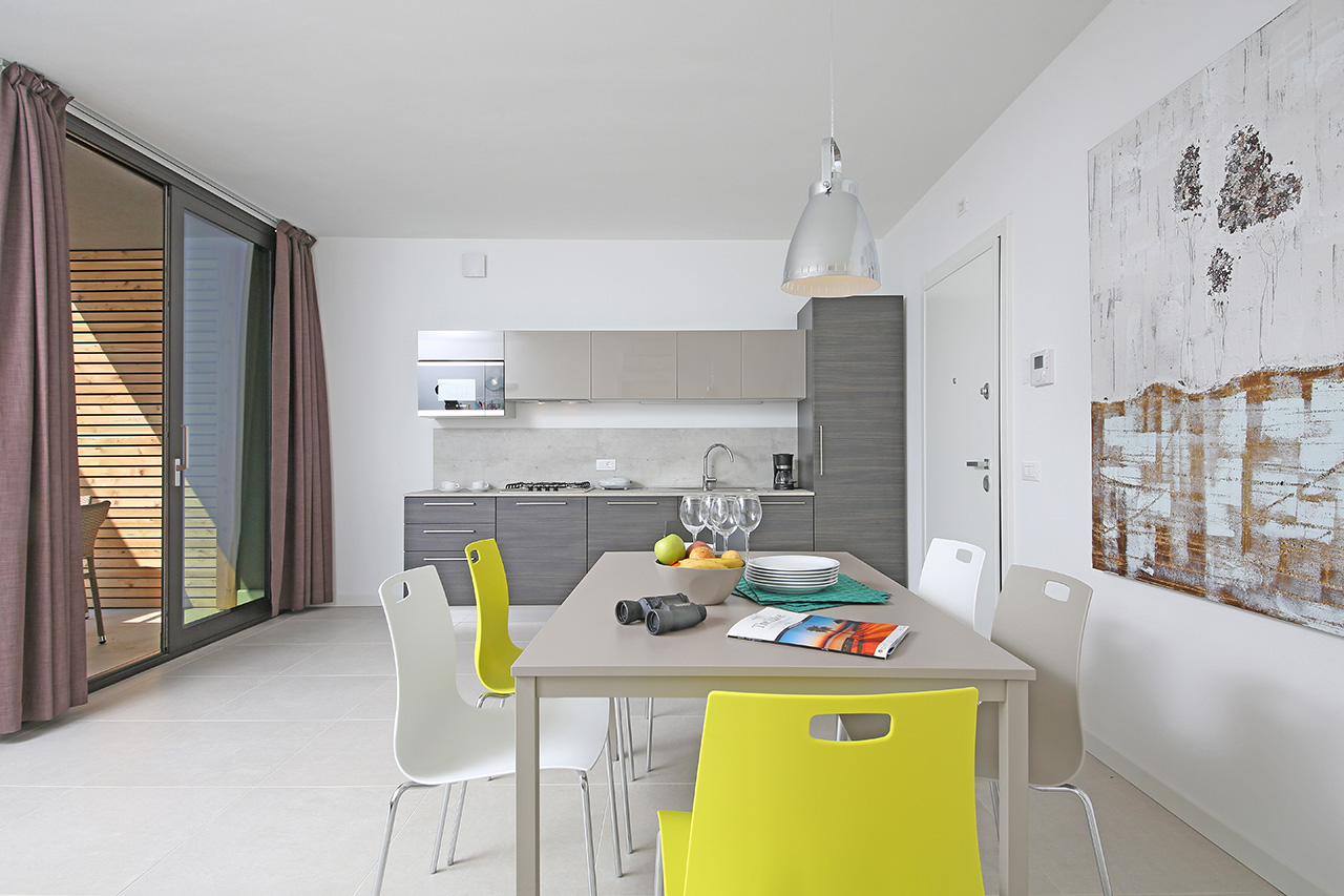 Appartamento con soggiorno, divano letto doppio, angolo cottura, una camera doppia, una camera a 2 letti, bagno con doccia. Solarium con vista lago.