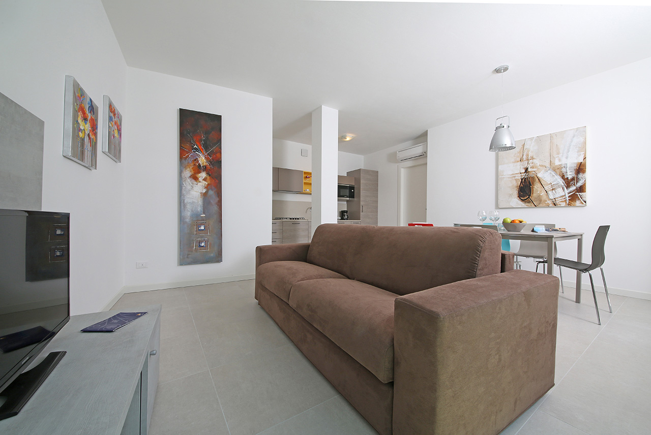 Appartamento con soggiorno, divano letto doppio, angolo cottura, una camera doppia, una camera a 2 letti o letto matrimoniale, bagno con doccia. Balcone / terrazza.